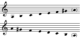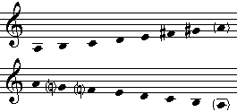 I pentagrammi delle scale minori sono stati scritti uno sotto l'altro per motivi di spazio. Si rimanda alle pubblicazioni in materia per avere le intere (!) scale svolte per l'esecuzione sul doppio pentagramma in chiave di violino e di basso.