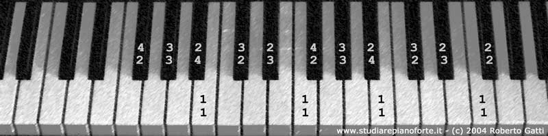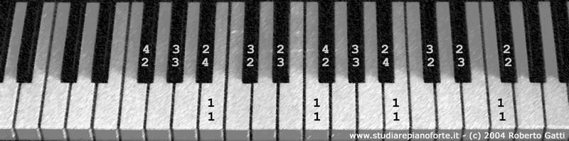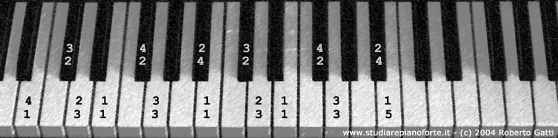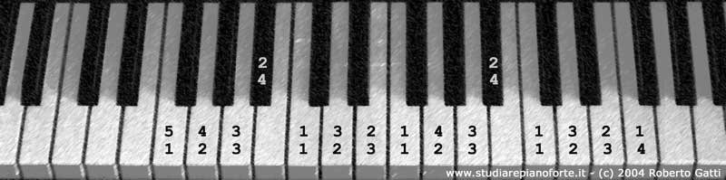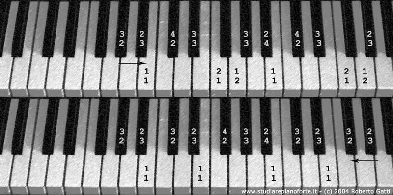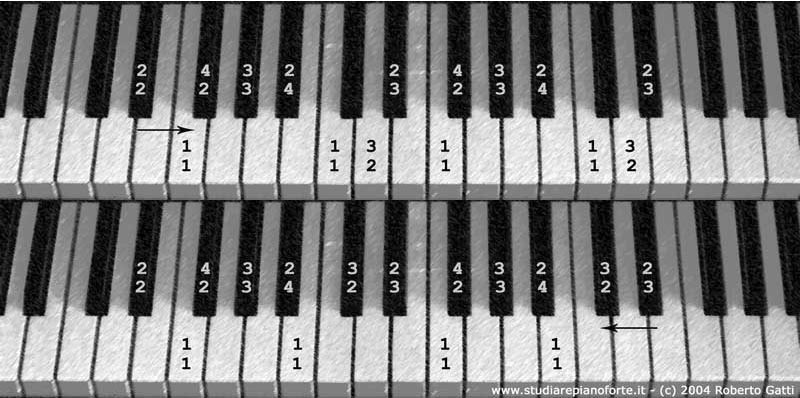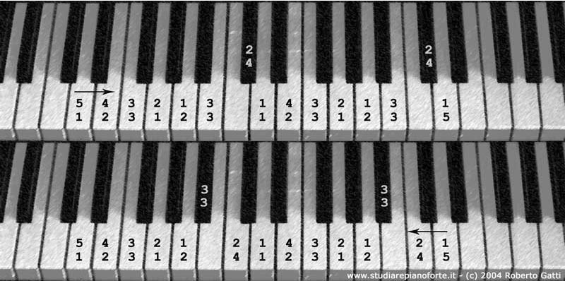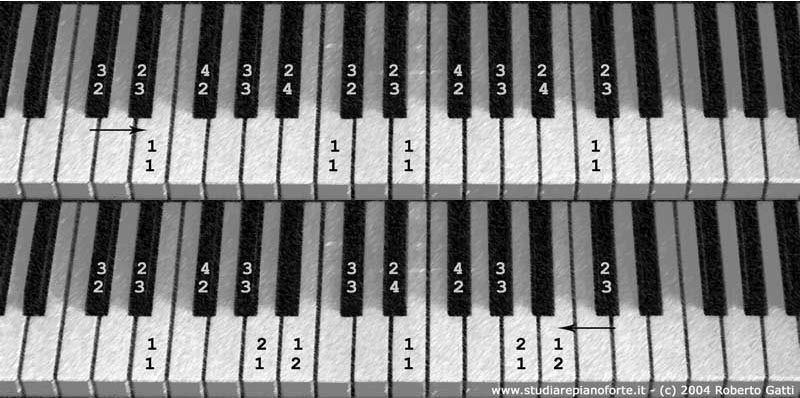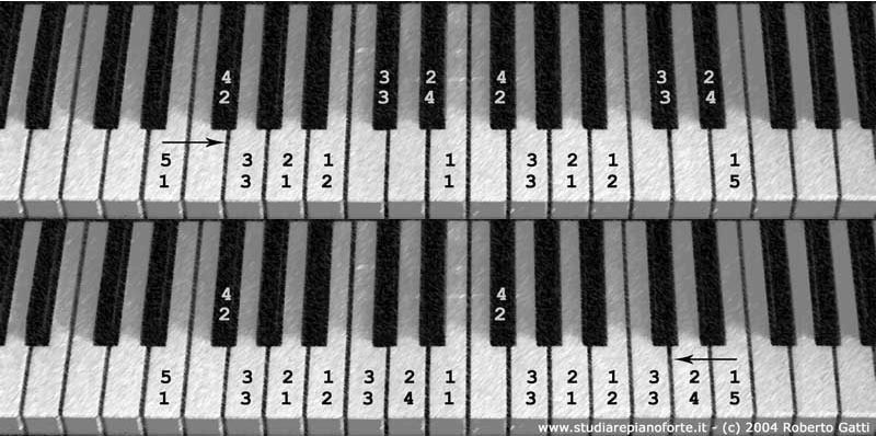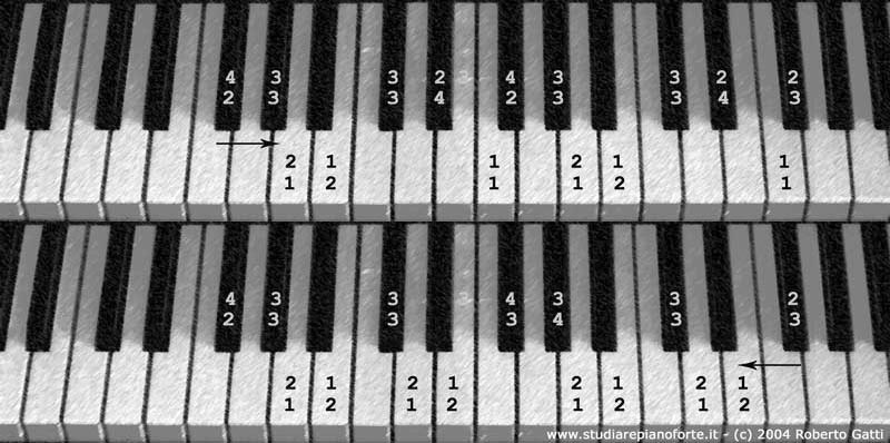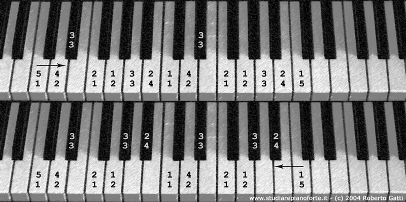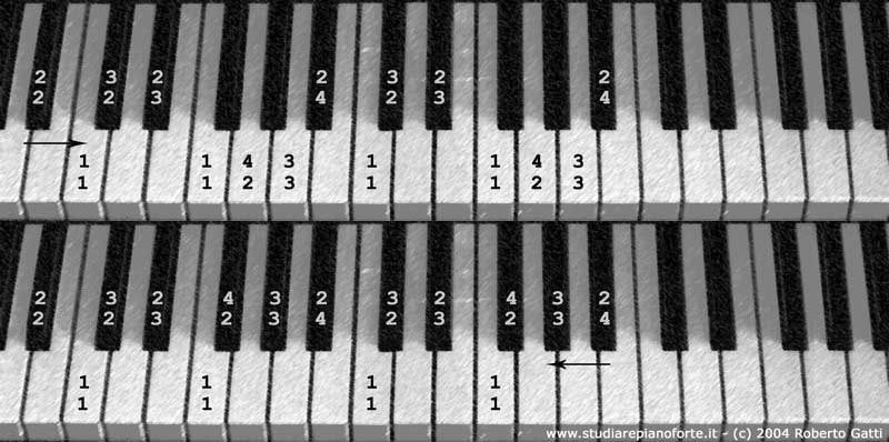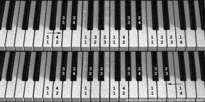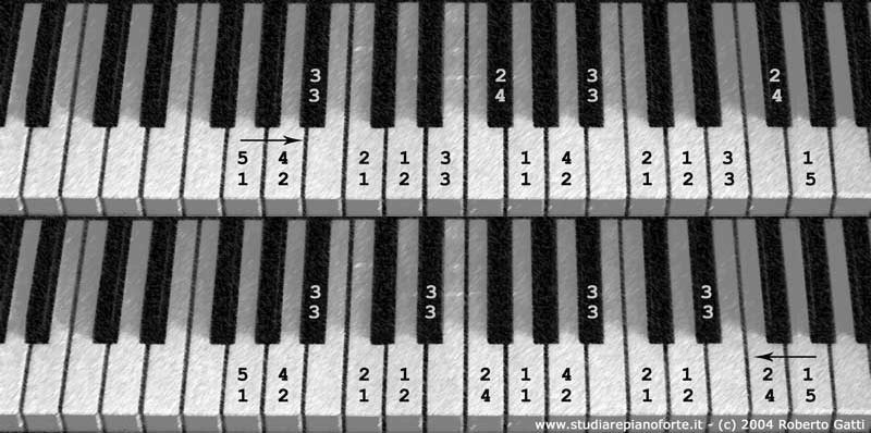Nei diagrammi con la tastiera, la fila di numeri superiore indica le dita della mano sinistra, quella inferiore quelle della mano destra; l'assenza della freccia indica che la scala si esegue nello istesso modo sia ad ascendere che a discendere.