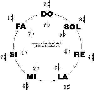 Come evidenziato dallo schema qui a destra, i diesis partono dal Fa e vengono aggiunti seguendo il senso orario di rotazione, i bemolli partono dal Si e seguono il senso antiorario.